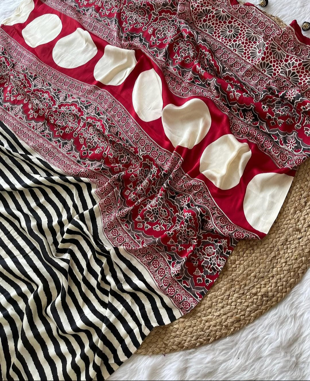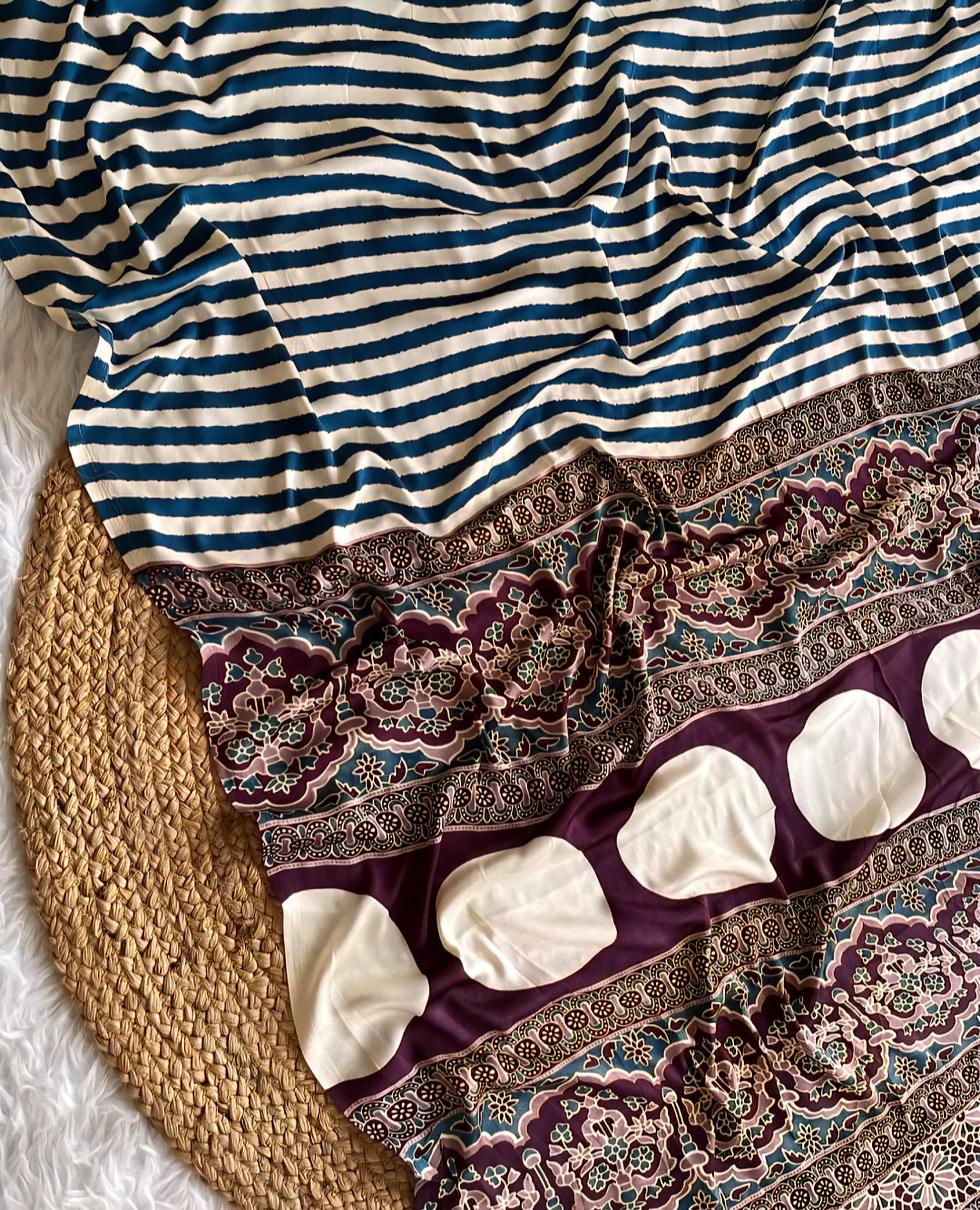 Experience the timeless elegance of Ajrakh sarees, meticulously crafted using ancient block-printing techniques originating from Sindh and Gujarat. Each saree features distinctive geometric patterns and natural dyes derived from indigo, madder root, and other organic sources. The intricate resist-dyeing process creates complex, multilayered designs that showcase exceptional artisanal skill while offering a sustainable fashion choice that honors centuries of textile heritage.