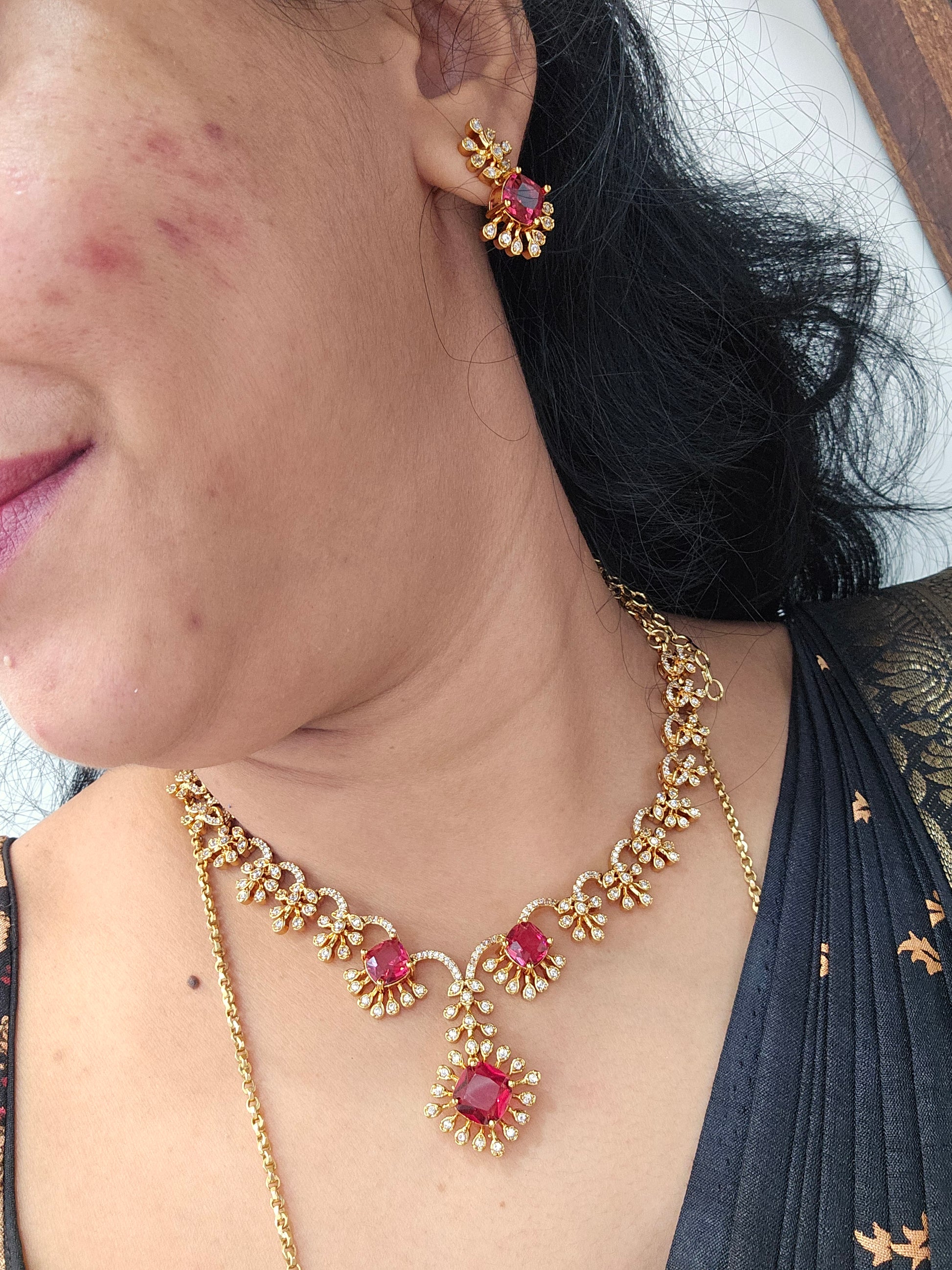 This elegant neck set, accompanied by matching earrings, offers a refined accessory choice for special occasions. Crafted to complement a variety of outfits, it enhances your look with a balanced blend of style and sophistication. Ideal for those seeking a coordinated jewelry set that adds a subtle yet impactful touch to their ensemble.