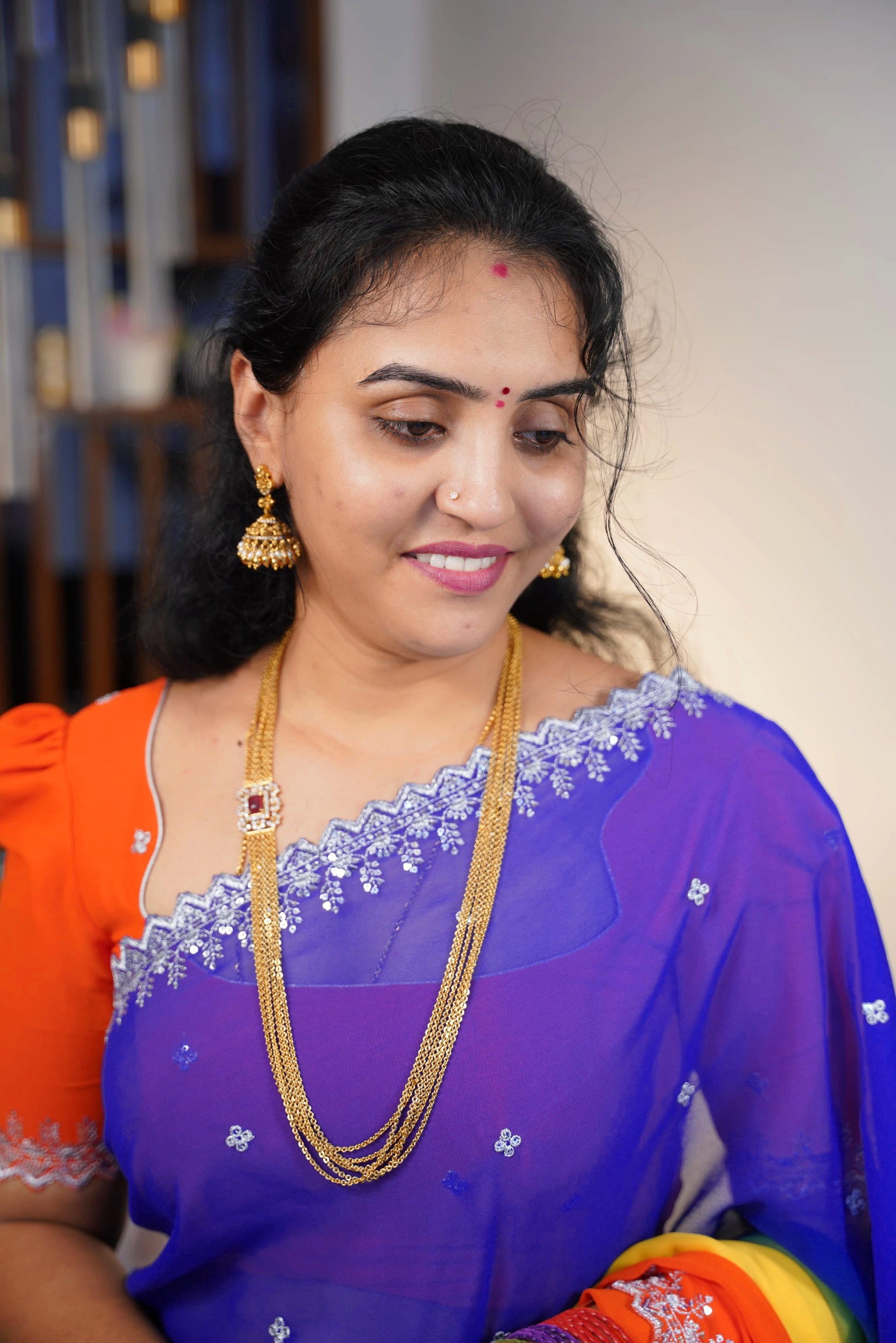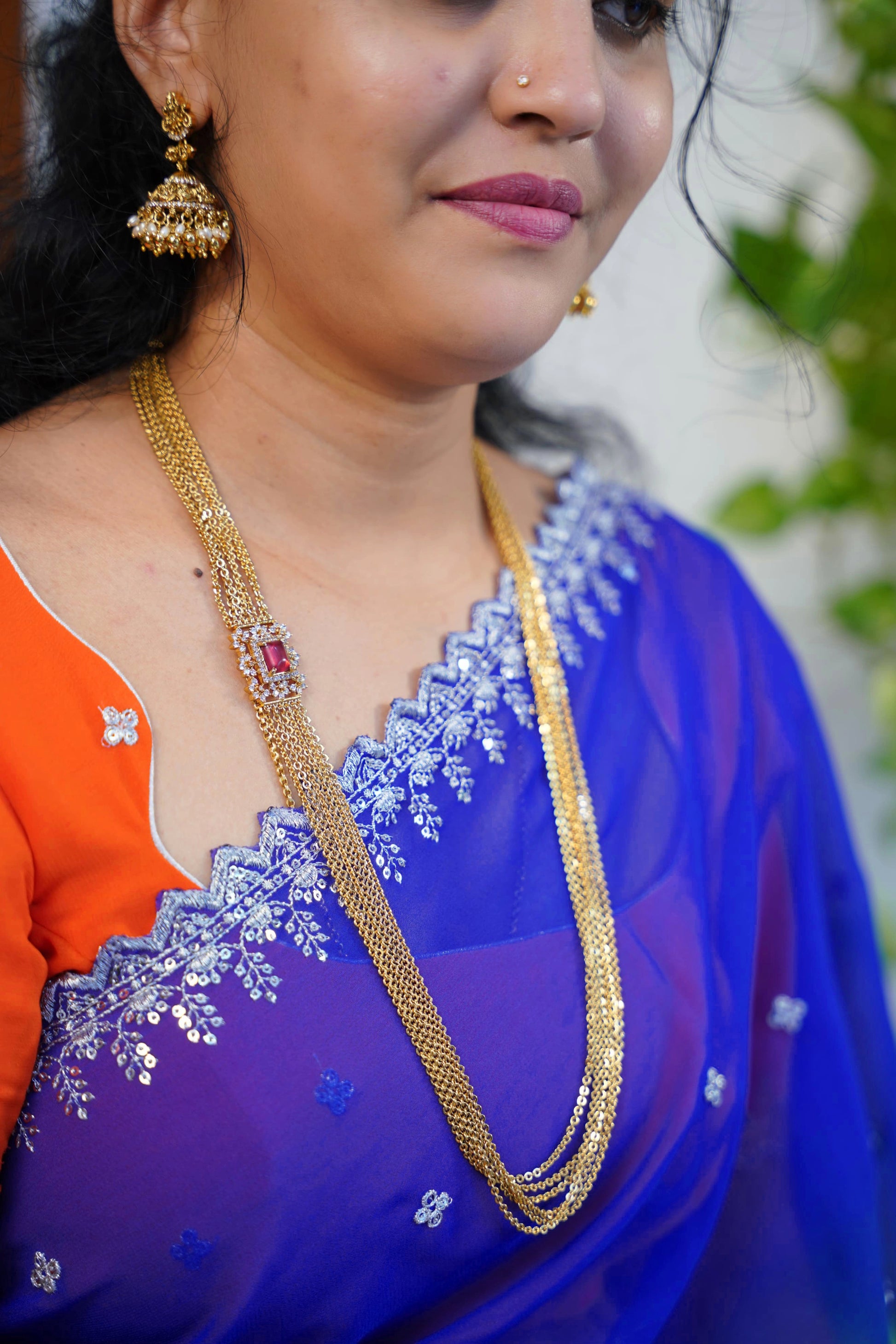 Exquisitely crafted diamond replica chandraharam featuring precision-cut cubic zirconia stones that capture light brilliantly. This traditional South Indian necklace design offers the luxurious appearance of diamonds without the premium cost. Perfect for weddings, festivals, and special occasions, this piece adds elegant sophistication to any ensemble.