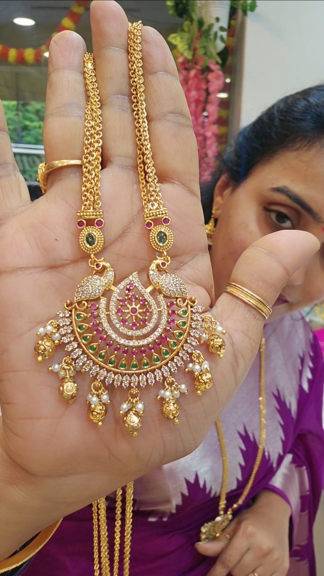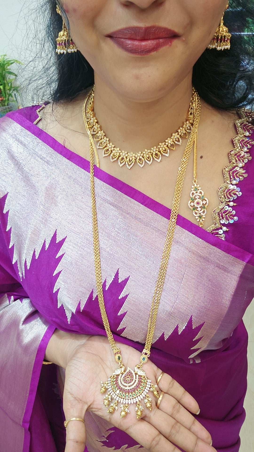 This long pended chandraharam showcases intricate craftsmanship with its elegant design, perfect for traditional occasions. Its extended length adds a graceful drape, enhancing the wearer's silhouette while maintaining comfort. Ideal for those seeking a timeless piece that combines cultural heritage with refined style.